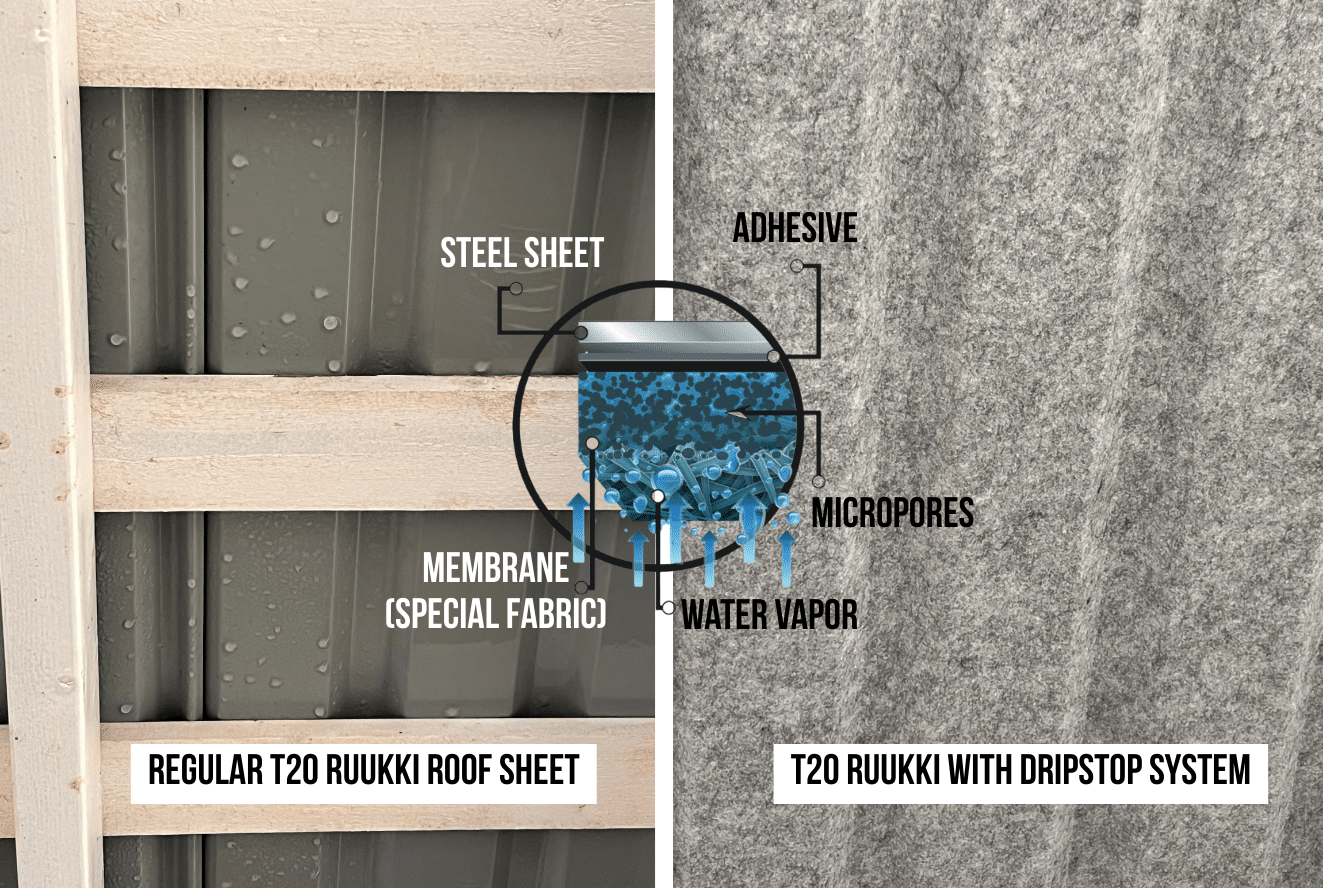 When the temperature drops to a certain level (dew point), moisture begins to condense on the underside of the profile sheet. This condensation can be managed either with an underlay or with DRIPSTOP fabric. The latter has a special structure and properties that absorb the condensation into the fabric, from which the water gradually evaporates through ventilation.