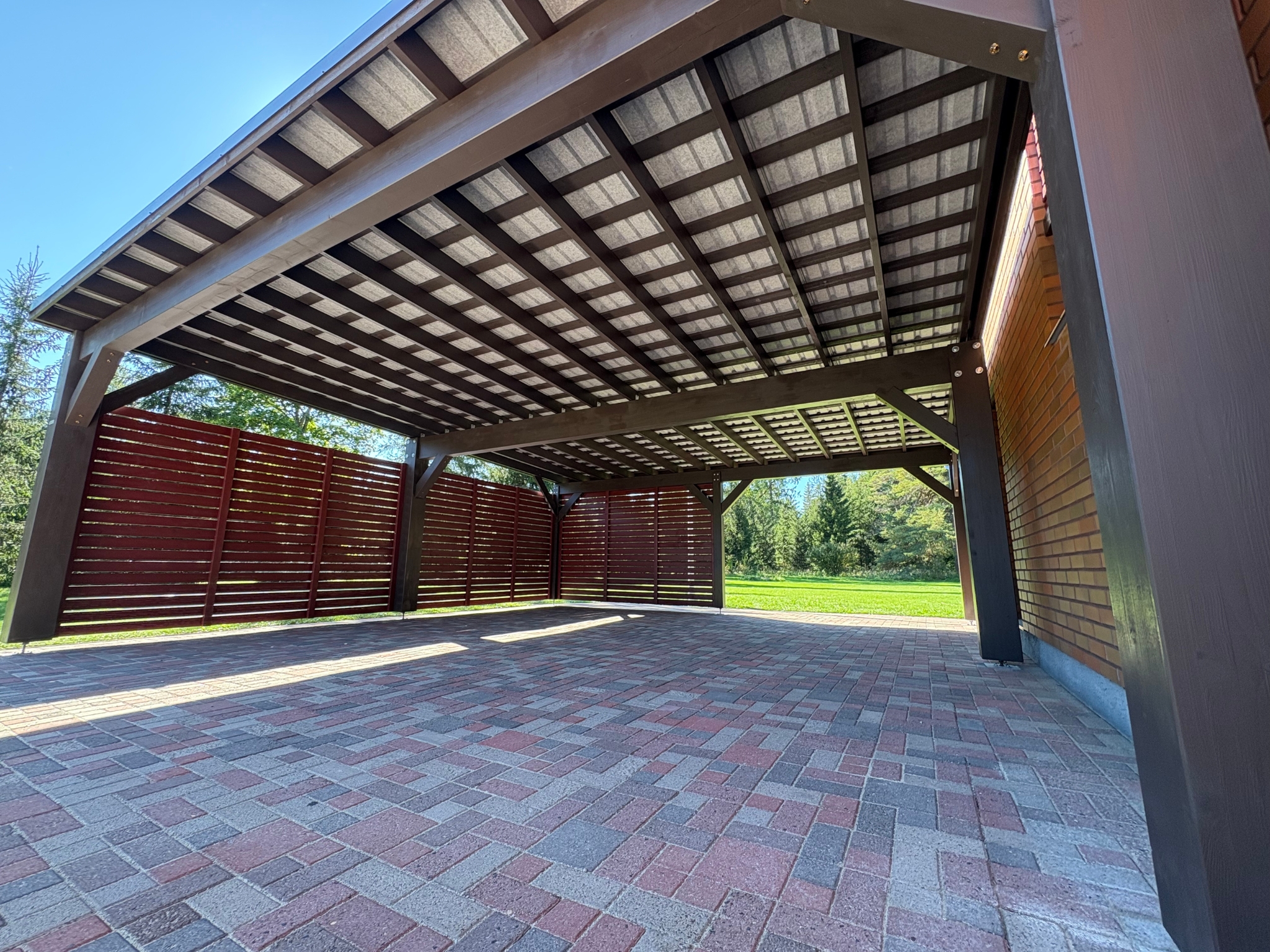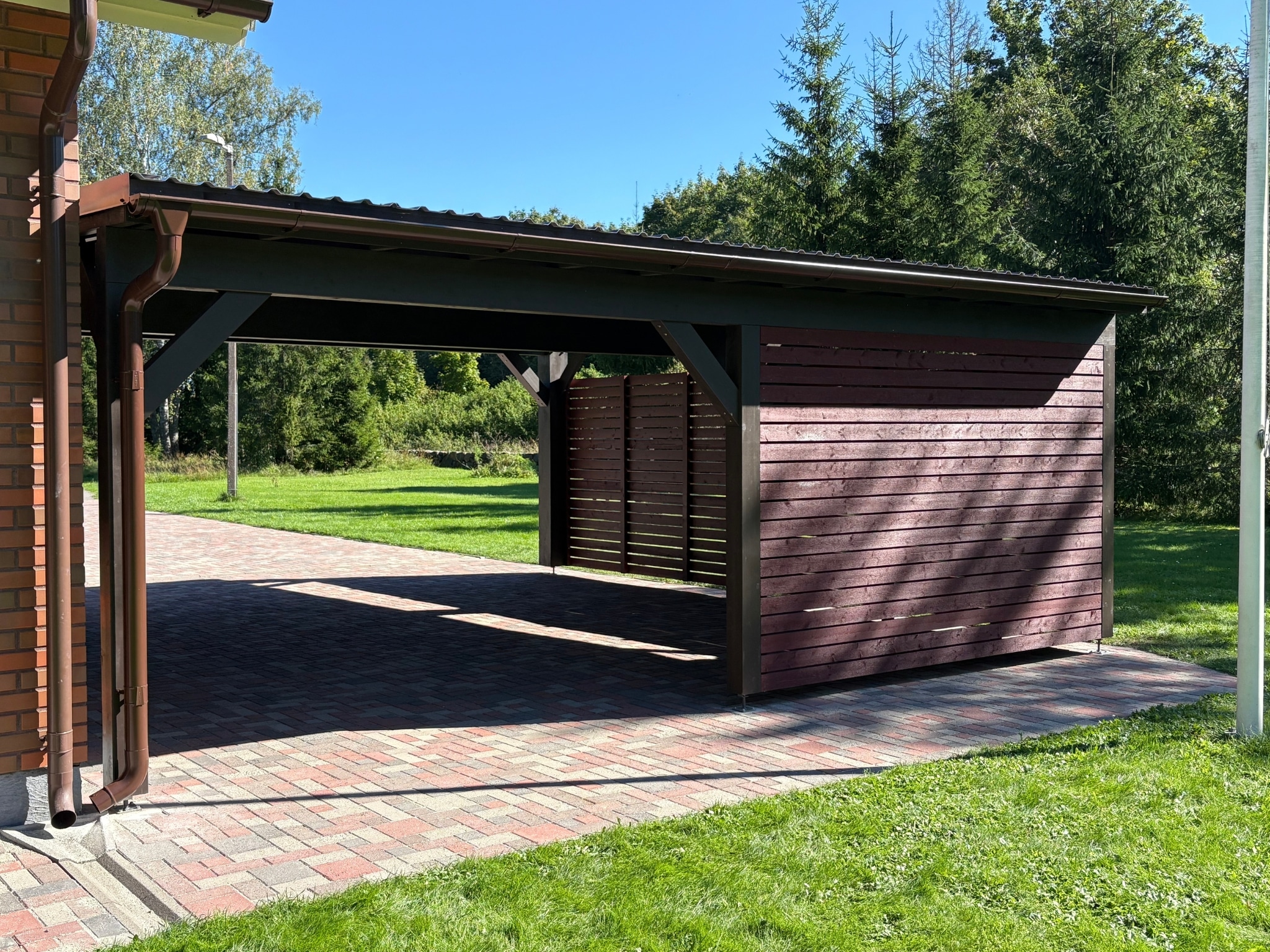 Katusekatteks T20 trapetsplekk sobiva tooniga. Lisatasu eest on võimalik juurde tellida antikondentsiaat kangaga Ruukki T20 katusekate, mis lahendab kondensiaadi tekkimisel tilkumise probleemi. Varjualusele on võimalik lisatasu eest juurde tellida seinad. Seinu on võimalik tellida moodulite kaupa, nii saate sulgeda vaid need küljed mida ise soovite. Antud mudelile on võimalik tellida kuni neli külgseina moodulit ja kaks tagaseina moodulit.