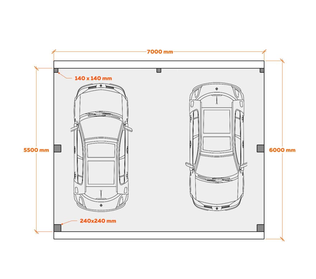 Carport Ralf 42 m², 250 kg/m². The support posts and load-bearing beams are made of glued laminated timber (glulam); the rest of the structure uses C24 strength-graded planed timber.